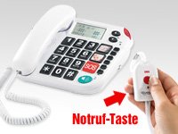 Garantruf: Technik, die Leben retten kann, exklusiv in Simvalley Notruf-Telefonen • Klar & deutlich: 3-zeiliges Spezial-Display mit einstellbarem Kontrast • Sehen & hören, wer anruft: liest auf Wunsch Anrufernummer vor • Platzsparende Maße: 18 x 17 x 7 cm Garantruf über mobilen SOS-Sender im Taschenformat: aktiviert die Notruf-Funktion am Telefon • Passt sich perfekt an: Lautstärke von Freisprechen, Klingelton und Sprachausgabe einstellbar • Hörgerätekompatibel • Farbe: weiß Garantruf mit Notruftaste am Telefon: ruft 5 Nummern hintereinander an, wechselt automatisch auf Freisprechen • 2 Schnellwahltasten mit Fotos: mit einem Klick anrufen • Sehen, wer angerufen hat: Anrufliste mit letzten 20 Anrufen • Benötigt 4 Backup-Batterien (AAA Micro, bitte dazu bestellen): erhält alle Einstellungen bei Stromausfall Kompaktes Notruf-Festnetz-Telefon mit extra großen Tasten (je 20 x 23 mm) • Einfach schön und übersichtlich: schlichtes Design mit kontrastreicher Beschriftung • Optisches Anruf-Signal durch intensive rote LED• Extras: Datum & Uhrzeit, Wahlwiederholung, Rückruf, Stummschaltung Inklusive Telefonkabel (2xRJ11), Netzteil, mobiler Notrufsender, dt. Anleitung